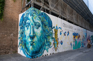 As part of the Farnese palace's facades restoration project, the 320m² palisade along Via del Mascherone served as a blank canvas. The 20 artists from around the world were selected through an open call based on a prompt to express their personal vision of the Palace, the people who have marked its history, its colors and its architectural details.