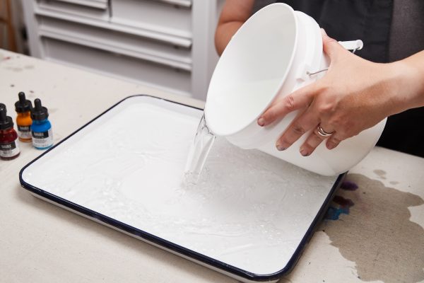 Make the marbling solution. In another bucket, mix 4 tbsp of Methocel into a gallon of warm distilled water and stir vigorously. Let this mixture sit until the bubbles disappear - this can take a few hours. Pour your Methocel mixture into your tray and wait for the bubbles to disappear.