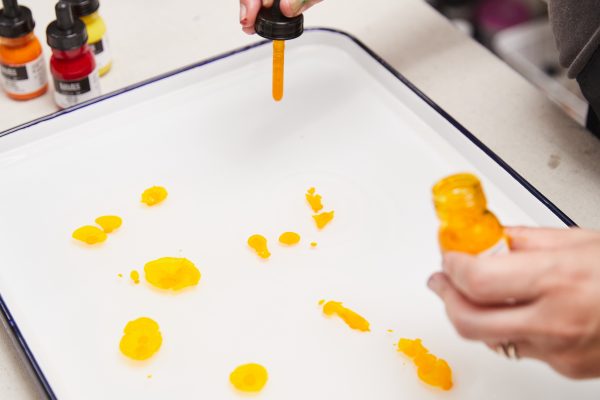 Drop. Using the dropper, create pools of Acrylic Ink, making sure to vary their size and placement across the surface of the water.