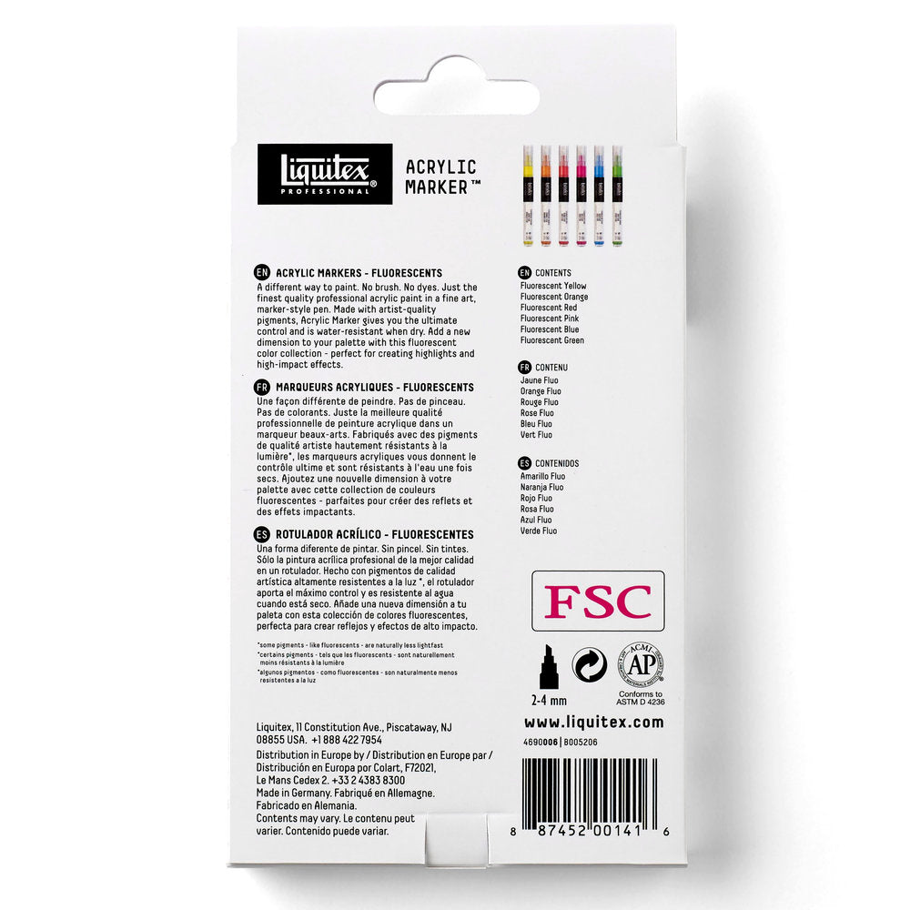 Set Contents:6 x 2mm Fine Professional Acrylic Markers - Fluorescent Yellow, Fluorescent Orange, Fluorescent Red, Fluorescent Blue, Fluorescent Green, Fluorescent Pink