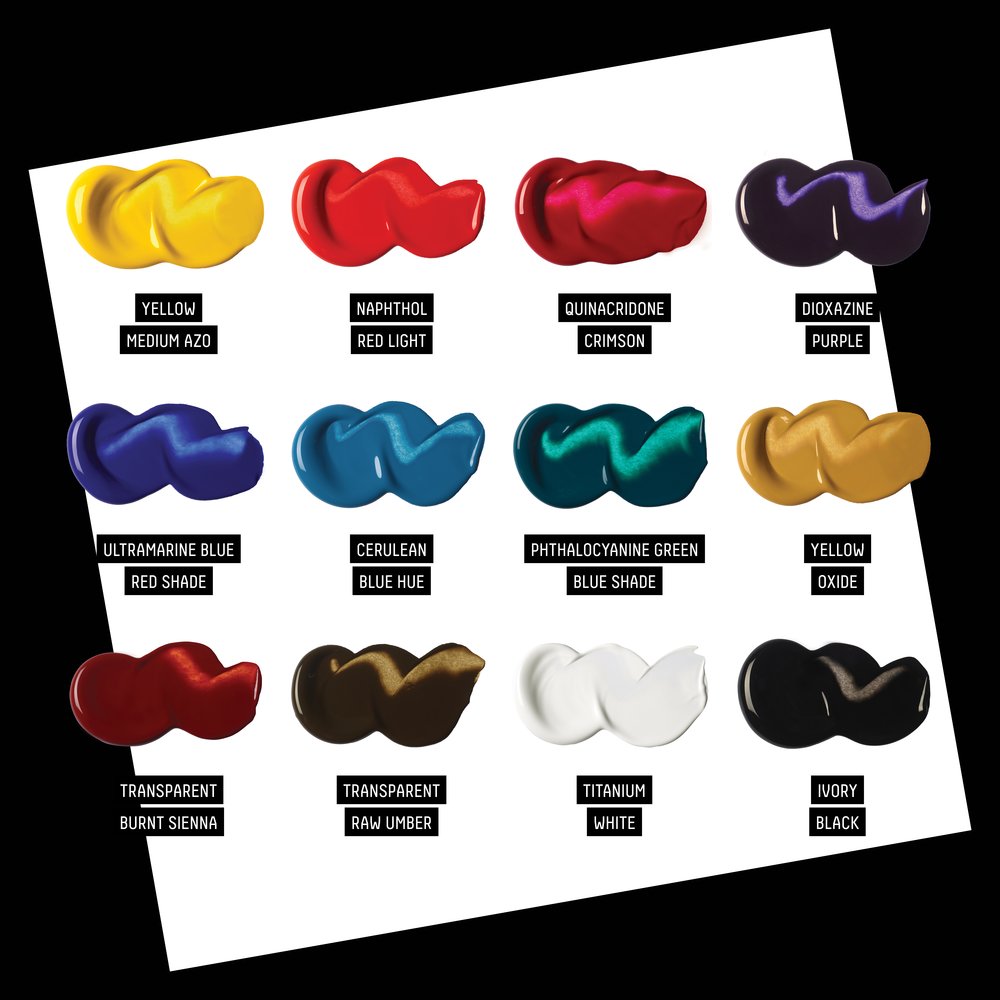 Set Contents:12 x 22ml Professional Soft Body Acrylic - Yellow Medium Azo, Quinacridone Crimson, Ultramarine Blue Red Shade, Naphthol Red light, Yellow Oxide, Transparent Burnt Sienna, Transparent Raw Umber, Phthalo Green Blue Shade, Cerulean Blue Hue, Dioxazine Purple, Titanium White, Ivory Black
