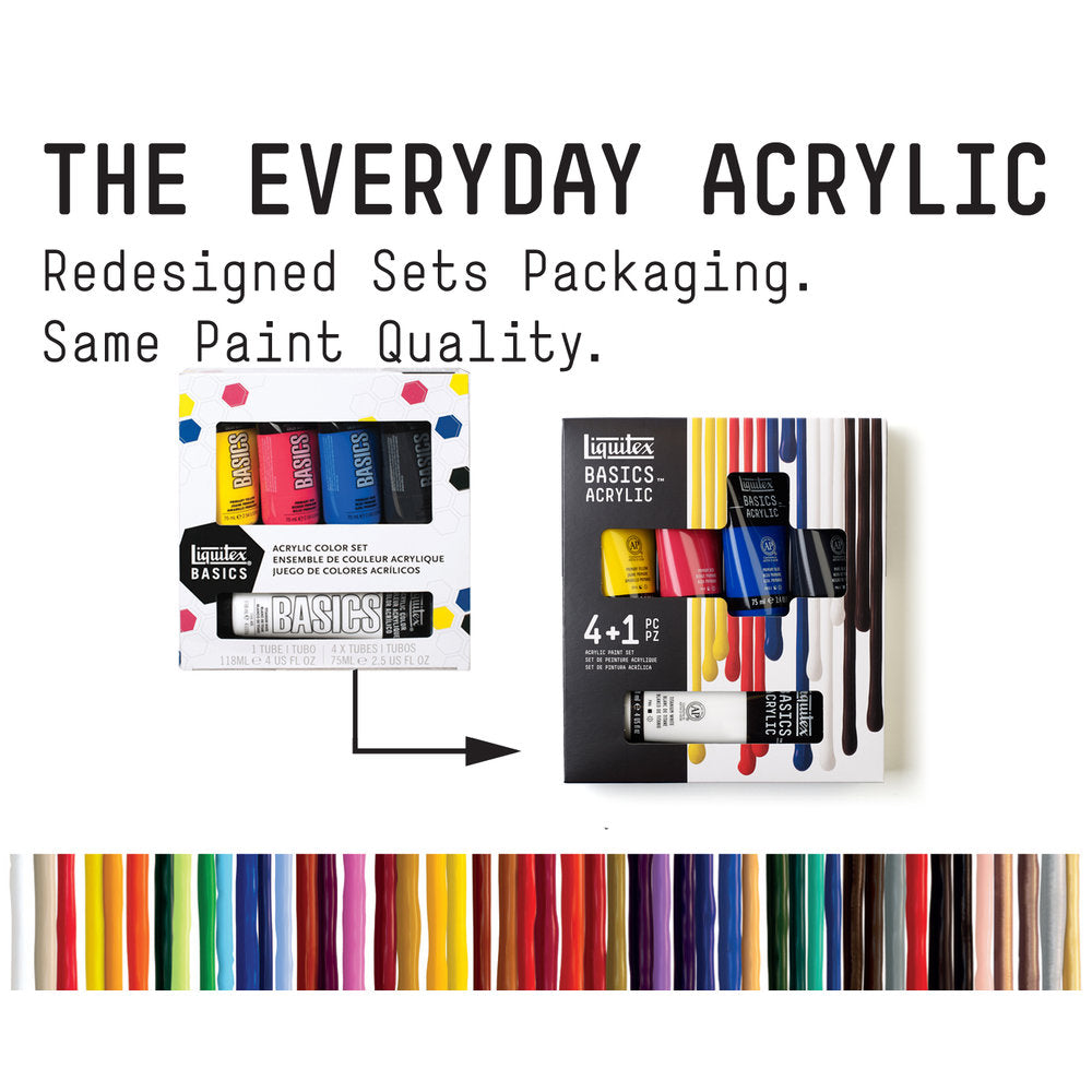 Set Contents: | 4 x 75ml (1 x 118ml) Basics Acrylic - Primary Red, Primary Blue, Primary Yellow, Ivory Black, 118ml Titanium White |