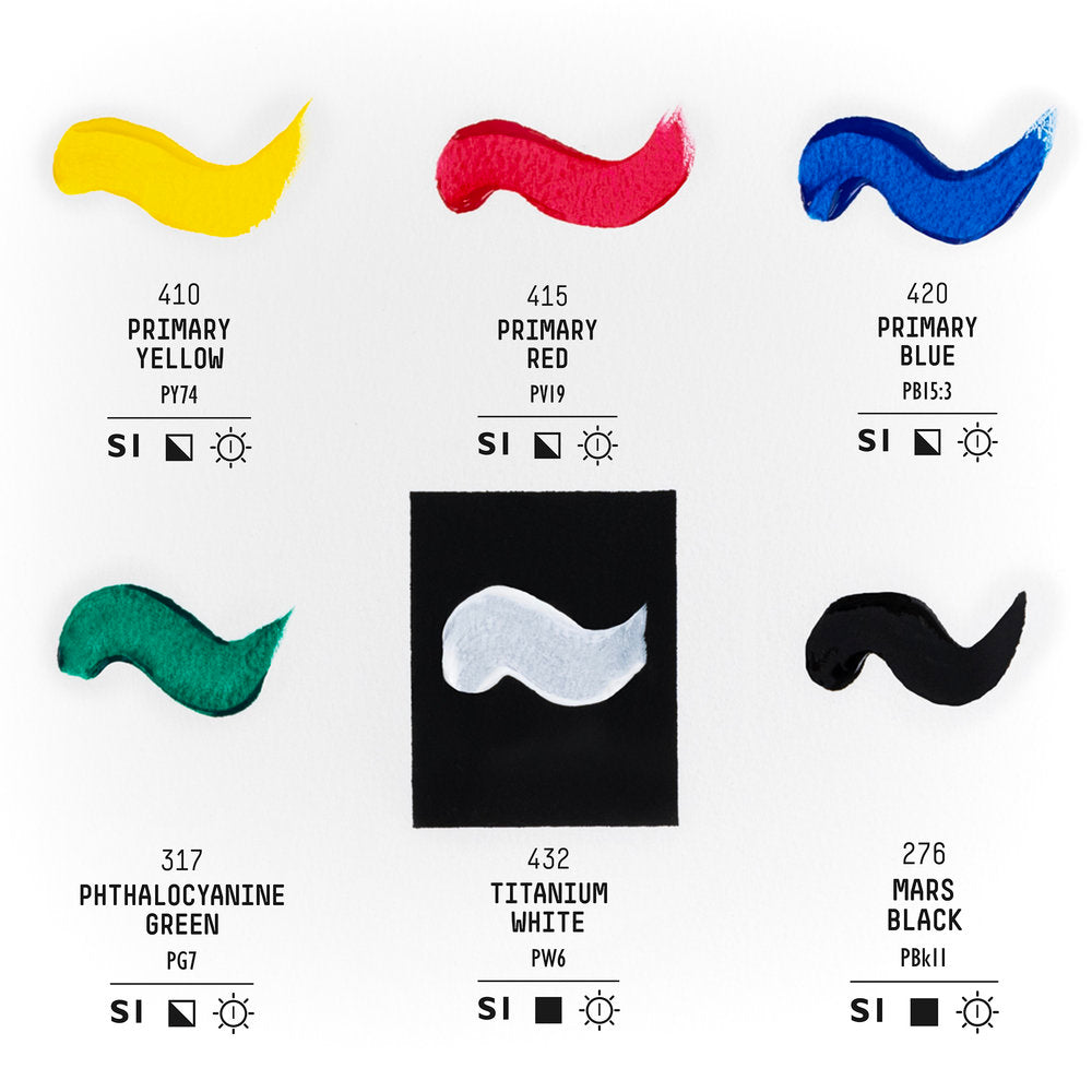 Set Contents: | Contains: Primary Yellow, Primary Red, Primary Blue, Phthalocyanine Green, Mars Black, Titanium White |