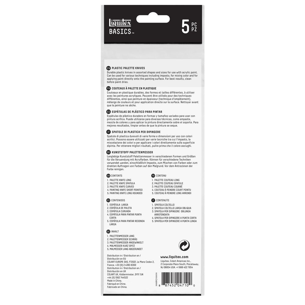 Set Contents:Plastic Tools: 1 x Palette Knife Long 1 x Palette Knife Spatula 1 x Palette Knife Curved 1 x Palette Knife Short Pointed 1 x Palette Knife Long Rounded