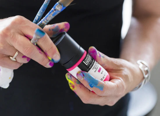 Think of gouache, think of saturated color. And ours packs a punch. The technology inside is complex, taking two years in the lab to develop. The innovative formula has a super-concentration of pure, ultra-fine pigments dispersed evenly in a flexible acrylic vehicle. It contains the highest intensity of pigment in any of our paints, giving you serious color payoff every time.