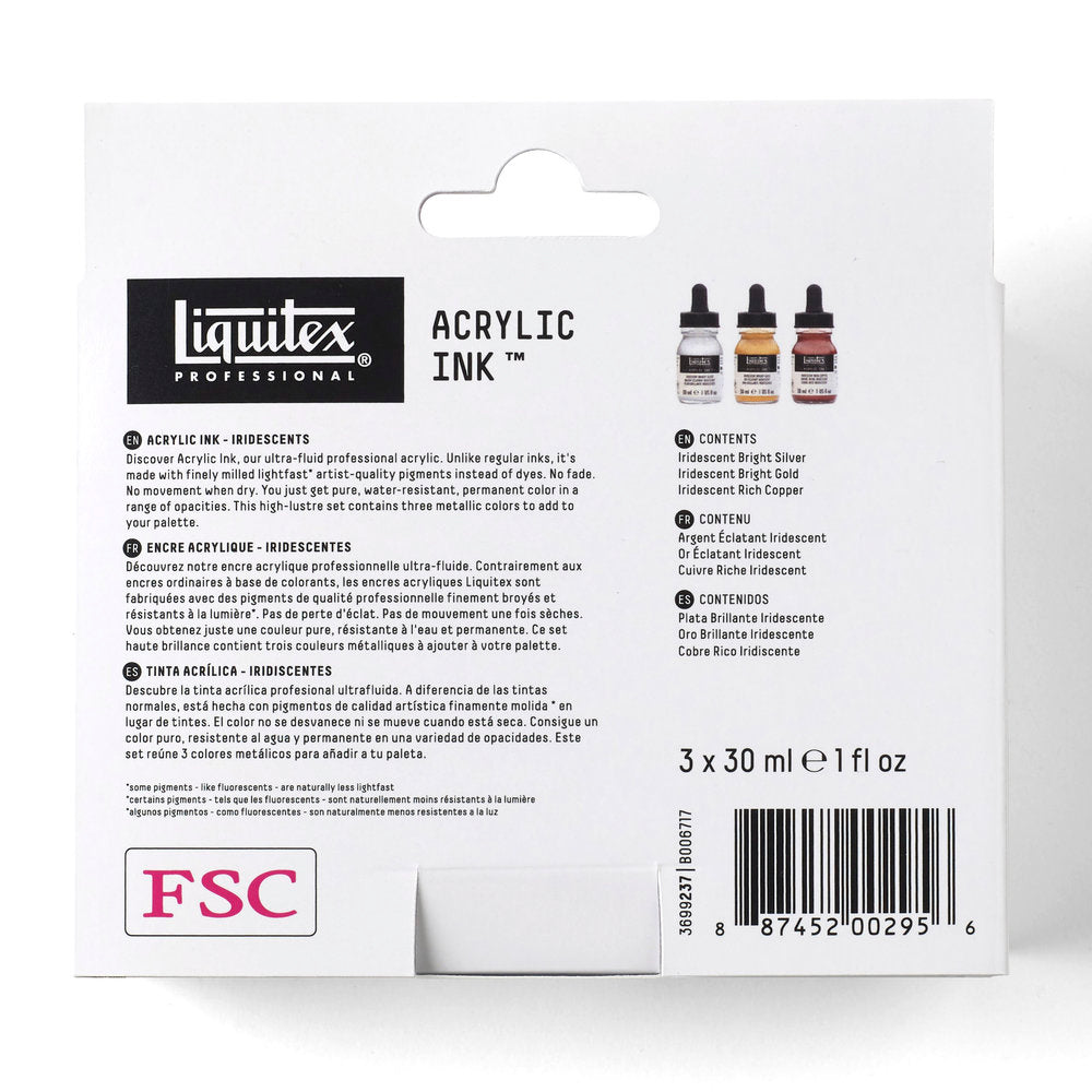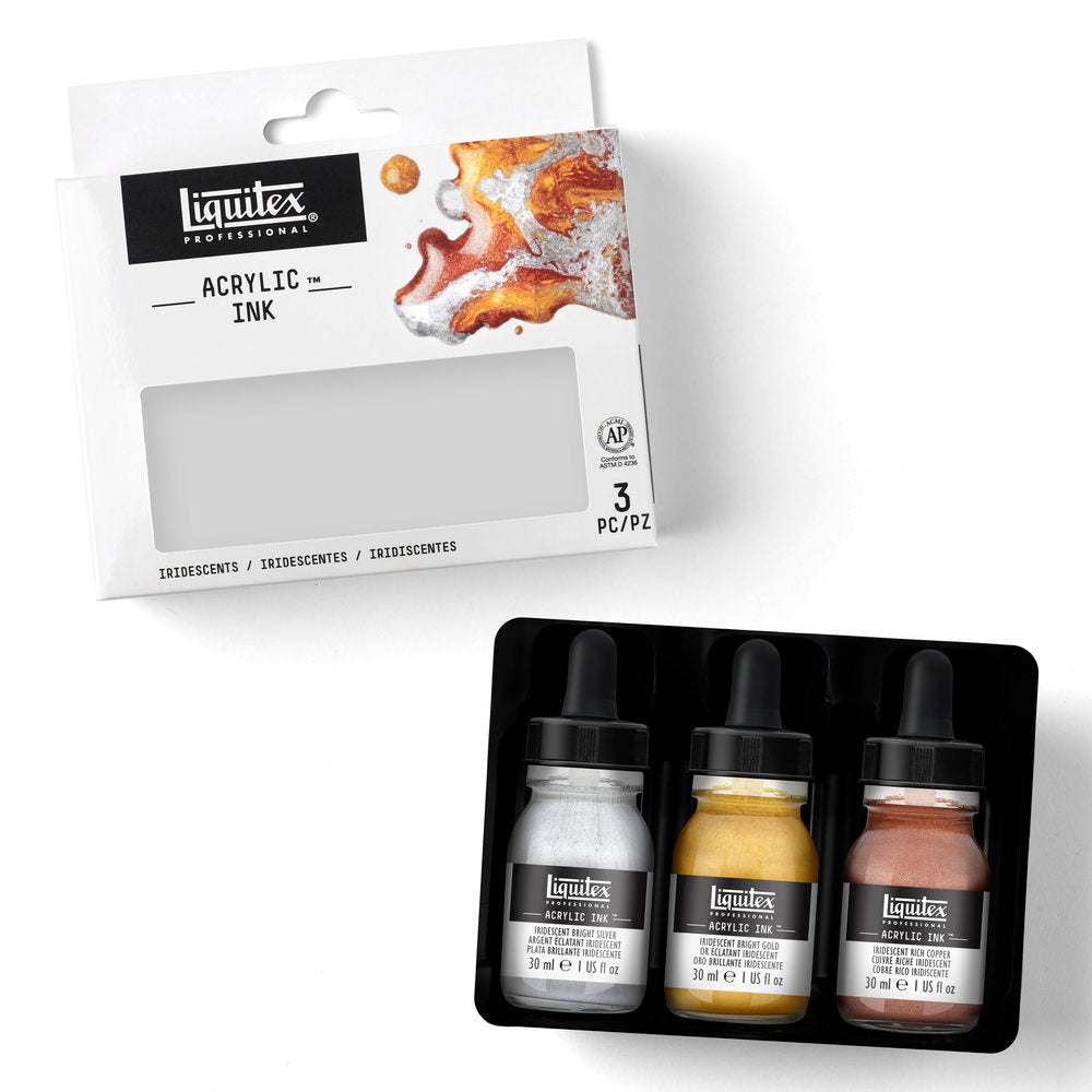 Set Contents:3 x 30ml Pofessional Acrylic Ink - Iridescent Bright Gold, Iridescent Bright Silver, Iridescent Rich Copper